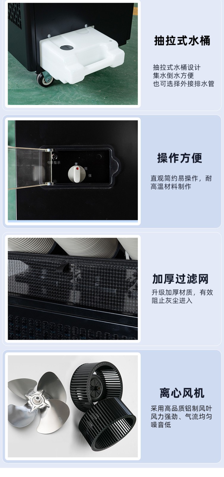 8、機身一體化設計,科學布局,可機內儲水桶積水.也可接水管排水,附帶除濕效果