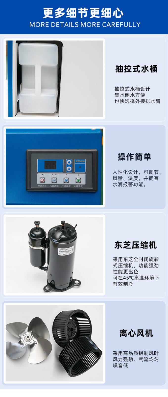 8、機身一體化設計,科學布局,可機內儲水桶積水.也可接水管排水,附帶除濕效果